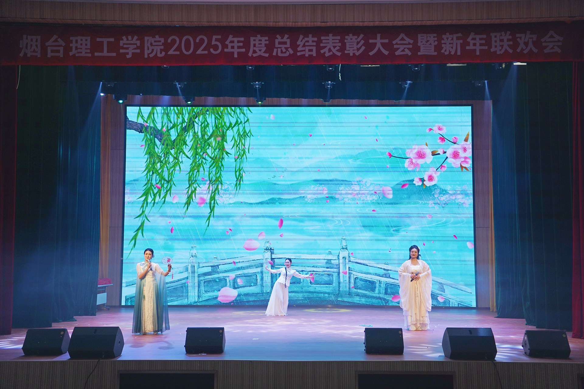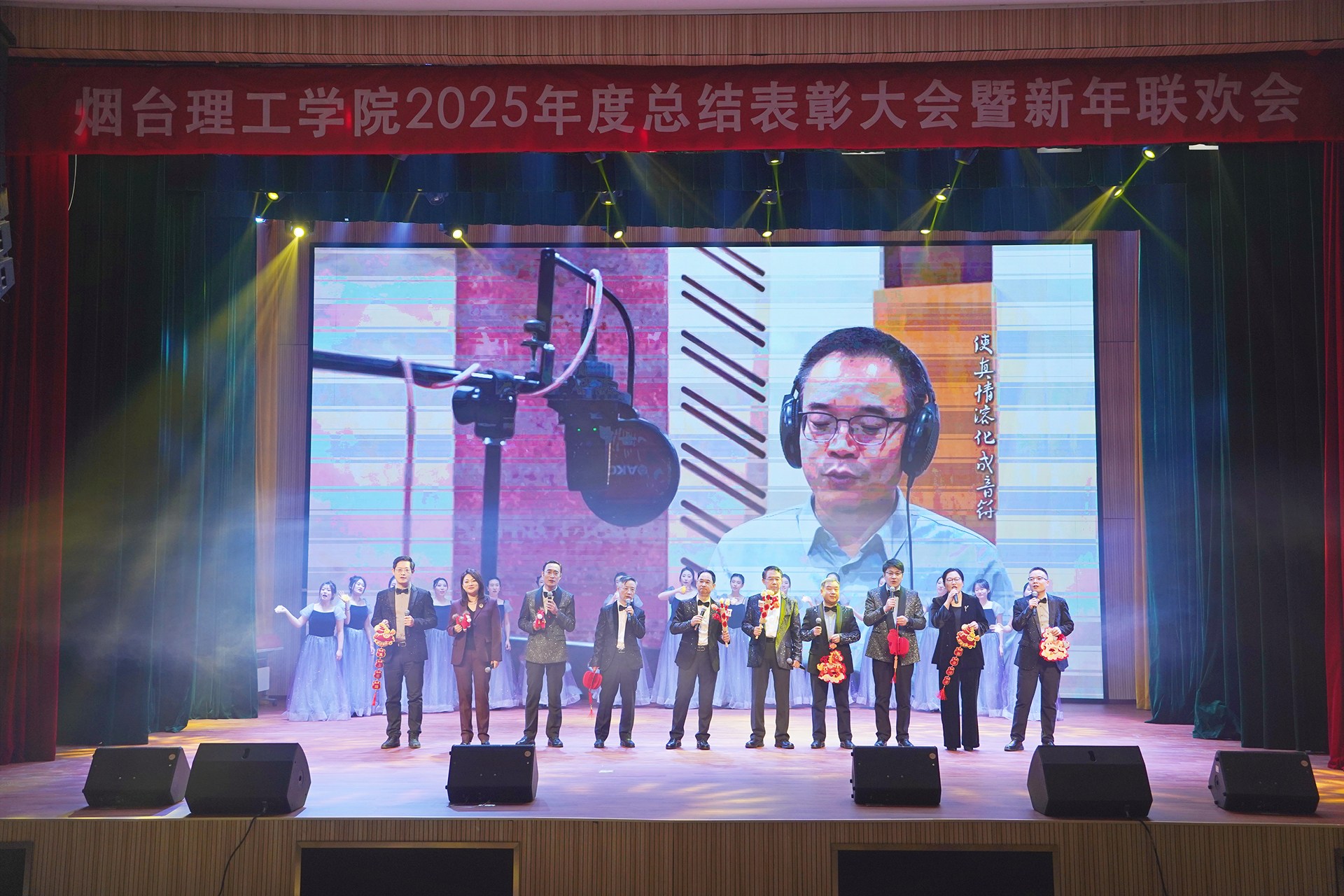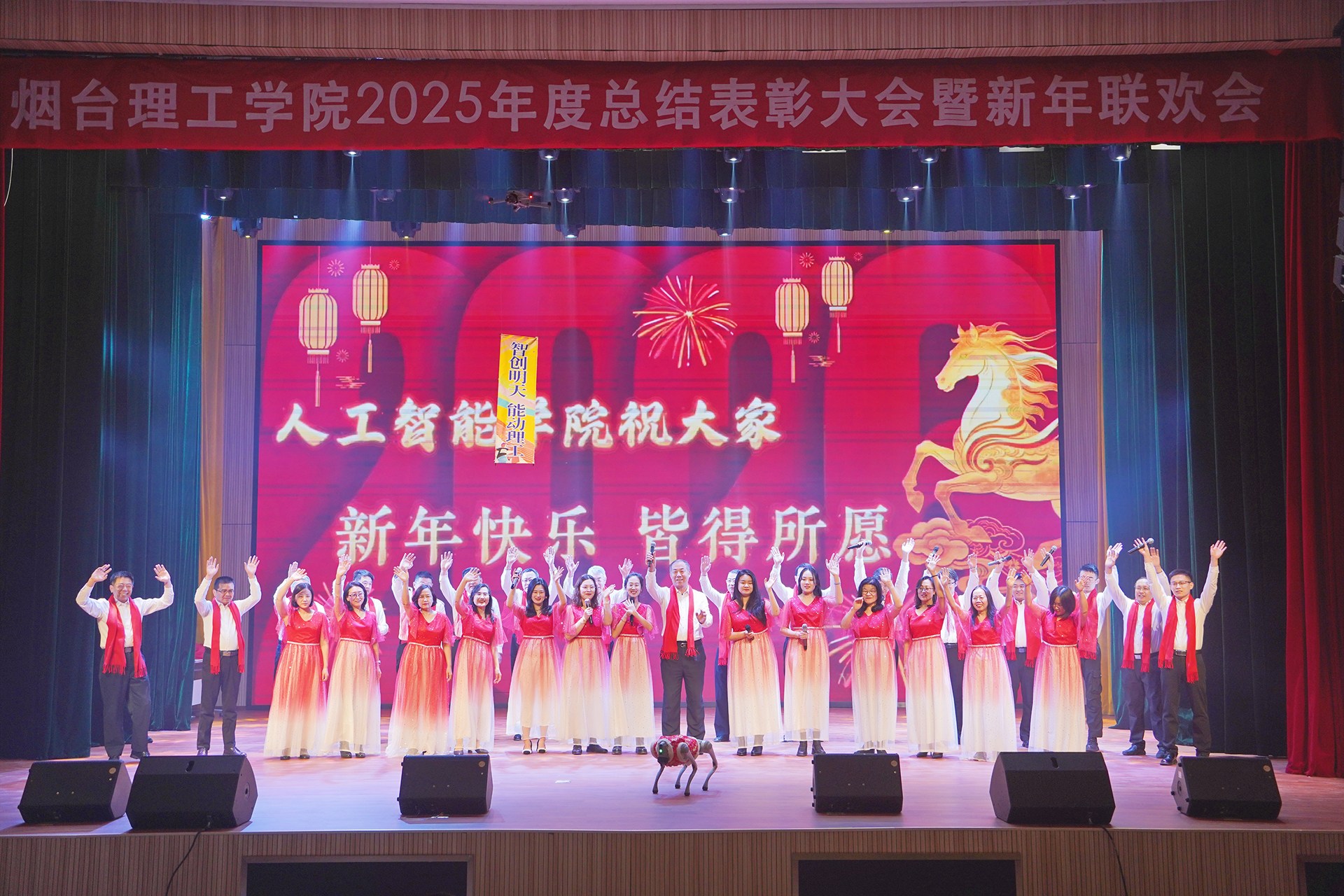 颁奖仪式后新年联欢会正式拉开序幕。节目形式丰富、内容精彩,展现了学校美育工作的丰硕成果和教职工多才多艺、积极向上的精神风貌。最后,全体人员齐声高唱《歌唱祖国》,激昂的歌声响彻全场,传递出对祖国的无限热爱与对学校未来的美好期许。